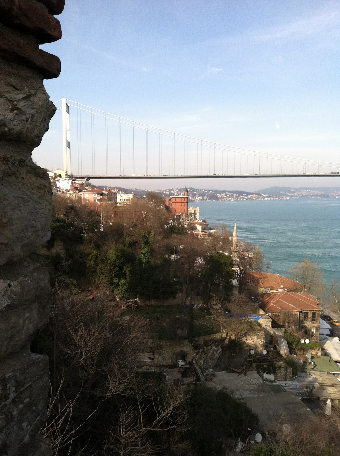 You could pretty much climb anywhere you wanted. There were small staircases (without rails) that wound around the sides of the structures. You can see one in the photo below. There were guards around, but they didn't really care what you did. When you climbed up, there were beautiful views! In many of the photos, you can see one of the few bridges across the Bosphorus. Anything across the strait is Asia.